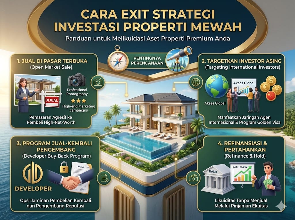Berapa lama idealnya hold properti mewah? Minimal 5 tahun — untuk lewati biaya transaksi dan siklus pasar. Apakah harus jual saat pasar peak? Tidak wajib — tapi jika sudah capai target profit, pertimbangkan ambil sebagian. Bagaimana kalau butuh dana cepat? Fokus ke pembeli tunai — proses closing bisa 14–30 hari. Apakah bisa jual ke investor asing? Bisa — dengan struktur kepemilikan yang tepat (PT PMA atau hak pakai). Apakah Felix PropertyGuru bisa bantu jual? Bisa — kami punya jaringan pembeli premium dan strategi pemasaran tertutup untuk properti mewah.